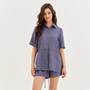 Комплект, состоящий из блузки и шорт. Блузка свободного кроя, длиной чуть ниже линии бедер. Выше линии талии настрочена кулиса и втянут шнур из основной ткани. Перед с нагрудными вытачками. В боковых швах обработаны разрезы. Рукава одношовные, втачные, длиной выше локтя, по низу с цельнокроеной манжетой. Воротник рубашечного типа с отрезной стойкой. Застежка на петли и пуговицы на цельнокроеной планке. Шорты свободного кроя, длиной выше середины бедра. Шорты на притачном поясе с частично вставленной резинкой. По задним половинкам талиевые вытачки. По передним половинкам обработаны боковые карманы с наклонным входом. В среднем шве имитация гульфика.