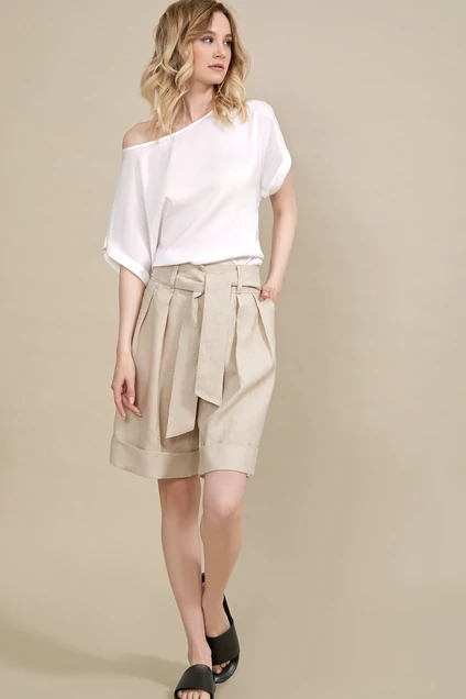 Льняные шорты с завышенной талией. Свободный крой, на поясе складки, по низу изделия манжеты. По бокам карманы. В комплект входит пояс из основной ткани.