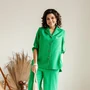 Костюм женский предназначен для повседневной носки. Костюм двух предметный: блузон и юбка-брюки. Блузон женский прямого силуэта, длиной ниже линии талии на 10 см. Перед цельнокроеный с двумя нагрудными вытачками, низ декорируется настрочной аппликацией. Спинка цельнокроеная. Горловина круглая, обтачная, без воротника. Блузон со спущенной проймой. Рукав втачной, короткий, одношовный с отложной манжетой. Блузон без плечевых накладок. Юбка-брюки прямая, длиной до середины икры, с отрезной кокеткой, с двумя нагрудными прямоугольными карманами с наклонным входом и двумя фигурными накладными карманами на задних половинках. Застежка на потайную тесьму-молнию в левом боковом шве. Верхний срез обтачной.Длина спинки блузона44- 50рры 50 см, 52-56рры 53 см. Длина рукава 44-50рры16.5 см, 52-56 рры 18 см. Длина юбки-брюк 44-56 рры 75 см