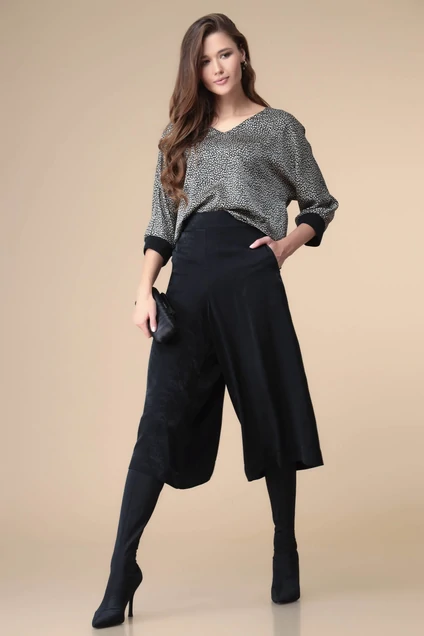 Костюм женский относится к нарядной торжественной одежде. Костюм двух предметный: блузон и брюки. Блузон женский прямого силуэта, длиной выше линии бедер на 3 см. Перед и спинка цельнокроенные. Перед декорирован термоаппликацией. Горловина с V-образным вырезом, обтачная, без воротника. Рукав цельнокроенный, длиной 3/4, с притачной манжетой из отделочной ткани. Блузон без плечевых накладок. Брюки женские, прямые. Передние половинки с карманами в боковых швах. Задние половинки цельнокроенные. Верхний срез с притачным поясом, по спинке собранным на эластичную тесьму. Длина спинки 57см. Длина рукава от горловины 54см. Длина брюк 75см