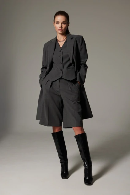 Стильный костюм тройка, состоящий из жилета, шорт и жакета. Жилет приталенного силуэта с нагрудной вытачкой, талиевыми вытачками и средним швом по спинке, на подкладке. Спинка выполнена из вискозной подкладочной ткани. Спереди прорезные карманы обманки, застежка центральная на петли - пуговицы. По переду фигурная линия низа. Шорты-бермуды свободного, прямого силуэта. На передних половинках заутюжены стрелки, переходящие в складки по линии талии. Застежка-гульфик, по переду боковые наклонные карманы. Пояс стабильный по переду, по задней части шорт на резинке, с настроченными шлевками и застежкой на пуговичку. Жакет свободного силуэта, с цельнокроеными бочками, на подкладке. Воротник пиджачного типа с отложным лацканом, на левой полочке листочка. Спереди прорезные карманы в рамку с клапаном. Универсальный костюм, лаконичный и безупречный, закрывает все потребности базового гардероба. Длина шорт по боковому шву с поясом 60 см. Ширина шорт по низу +-35 см. в полуобхвате. Длина жилета по среднему шву спинки 50,5 см Длина жакета по среднему шву спинки 100 см. Длина рукава 63 см.