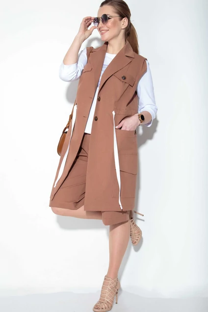 Идеальный вариант летнего комплекта, состоящего из жилета, майки и шорт. Жилет и шорты выполнены из летней костюмной ткани. Майка из вискозного полотна. Печать на майте может отличаться от фото.