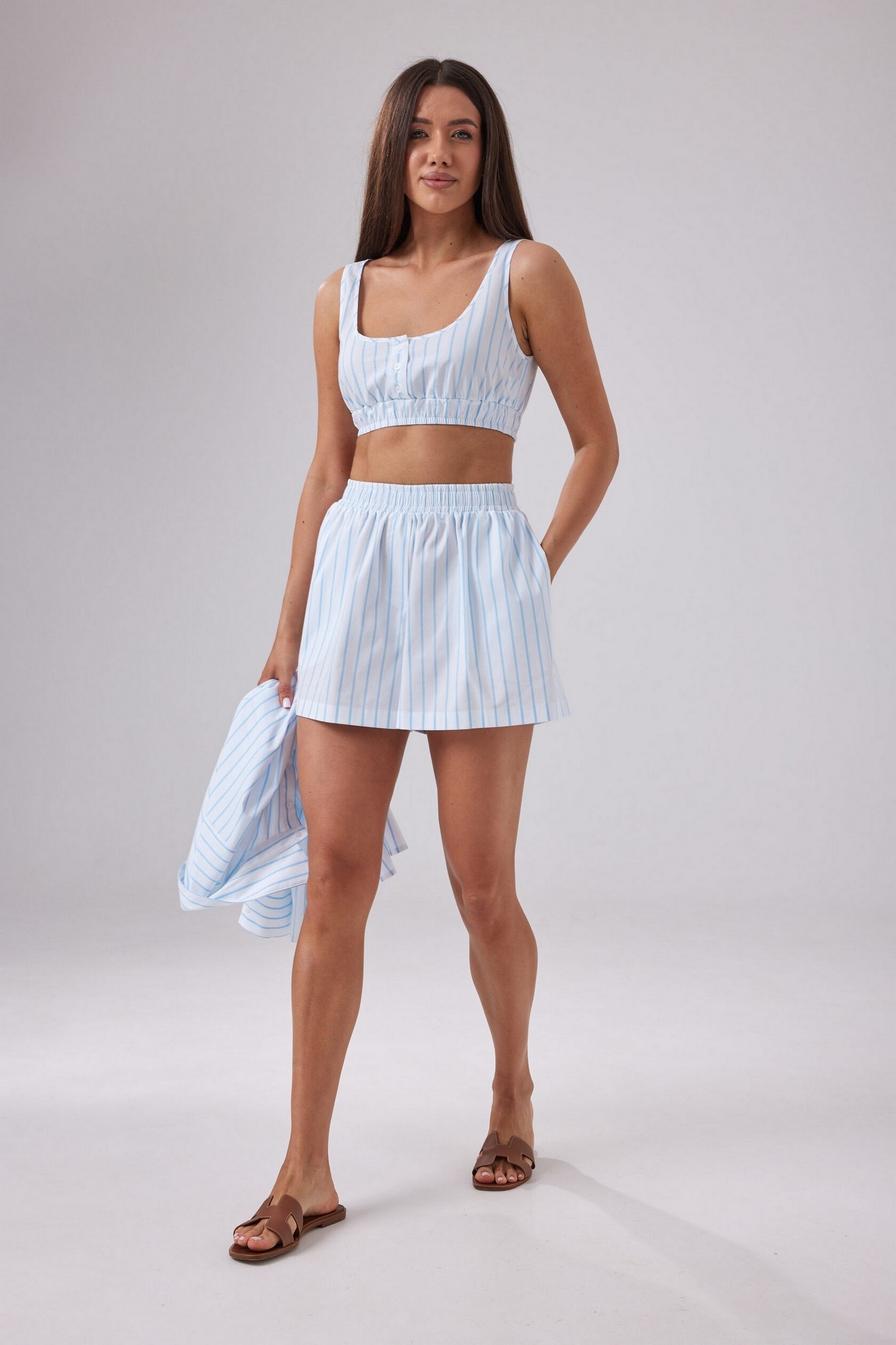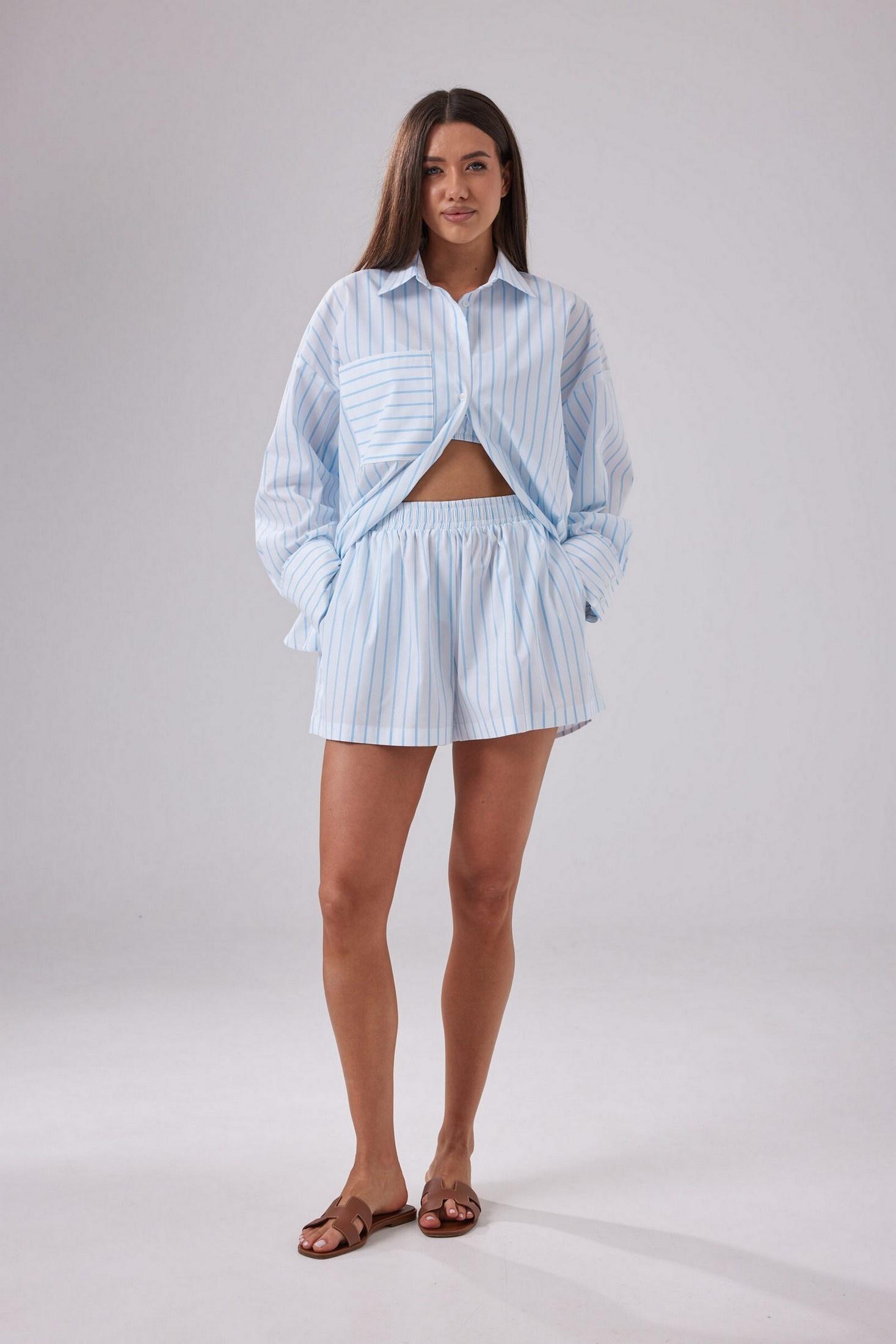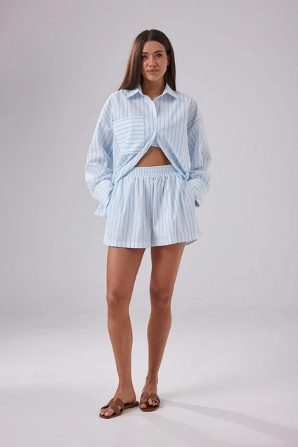 Летний женский комплект из натуральной хлопковой ткани — это сочетание непринуждённой элегантности и абсолютного комфорта, созданное для тёплых дней. Комплект состоит из рубашки и шорт.