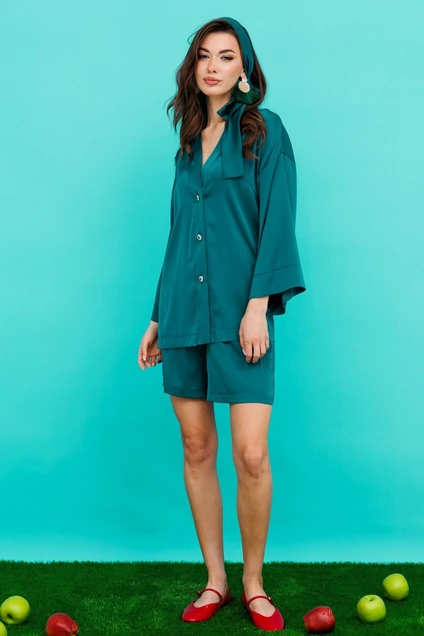 Летний костюм из ормани шелка с идеальной посадкой , шикарный выбор этим летом. Прекрасно корректирует фигуру, скрывает все изъяны. Широкая рубашка-кимоно на пугавицах с съемным поясом , шорты свободного кроя на резинке с двумя боковыми карманами. Премиальное качество.