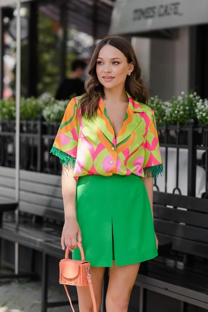 Блузка с воротником, рукав 3/7, по низу рукава съемная декоративная тесьма в виде перьев ( перья только с зелеными шортами), шорты с завышенной талией, в левом боковом шве расположена потайная молния,