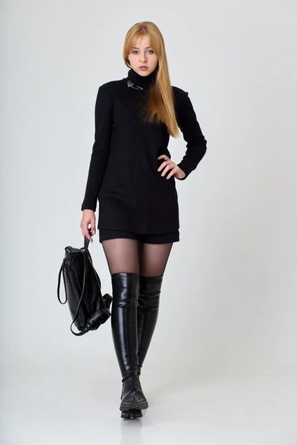 Современный удобный комплект из трикотажного полотна с добавлением шерсти состоит из туники и коротких плотных шорт.