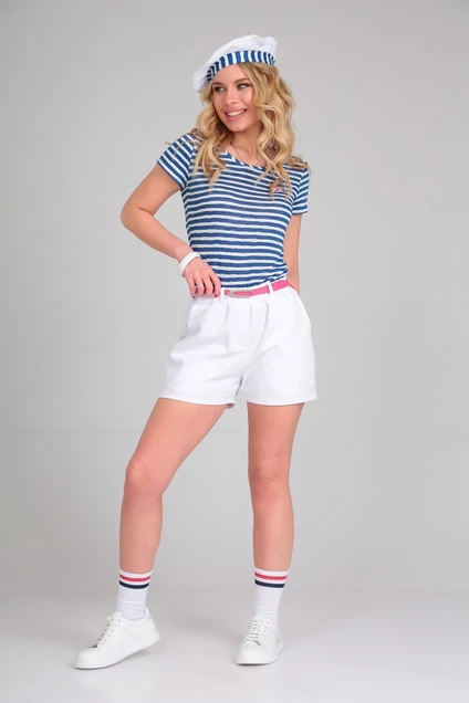 Современный ​​​​​комплект в морском стиле состоит из брюк (ткань хлопок) и трикотажной футболки «тельняшка». Акцентом является малиновый тонкий ремень.