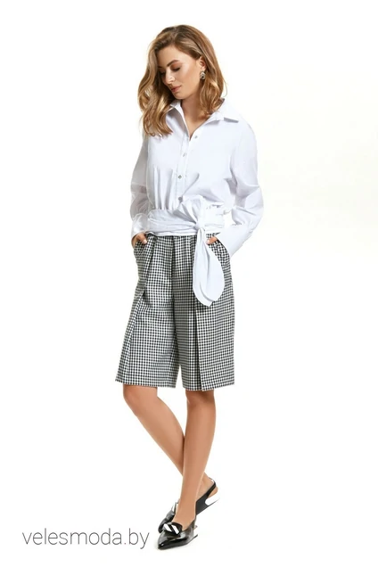Комплект из блузки и шорт из костюмной ткани. Укороченная блузка на широком втачном поясе с застежкой до низа на петли и пуговицы. Небольшой рубашечный воротник. Рукав на базе цельнокроеного с высокой манжетой. Есть съемный широкий пояс, мягко драпирующийся на бедрах. Шорты длиной до колена, расширенные к низу за счет складок по переду и с заутюженными стрелками. По талии на поясе-резинке. С карманами в боковых швах.