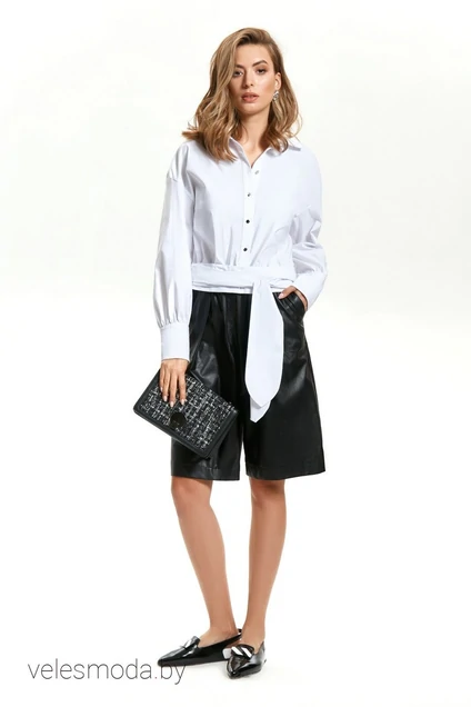 Комплект из блузки и кожаных шорт. Укороченная блузка на широком втачном поясе с застежкой до низа на петли и пуговицы. Небольшой рубашечный воротник. Рукав на базе цельнокроеного с высокой манжетой. Есть съемный широкий пояс, мягко драпирующийся на бедрах. Шорты длиной до колена, расширенные к низу за счет складок по переду. По талии на поясе-резинке. С карманами в боковых швах.