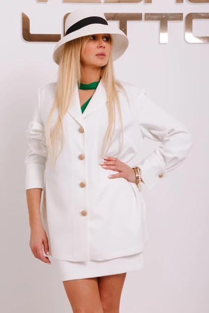 Комплект двухпредметный: блуза + шорты.Жакет удлинённый, прямого силуэта. Застёжка  спереди на пуговицы, линия плеча приспущенна. Спинка на кокетке, складка. V-образный вырез  горловины , отложные лацканы. Пиджачный воротник. Длинные рукава, с пуговицами на манжетах. По бокам разрезы. Без подкладки. Съёмный пояс.Юбка мини. Пояс со шлевками, к которым крепятся декоративные съёмные цепи. Спереди функциональные карманы. Застежка на молнию и пуговицу по спинке. Изделие на высококачественной подкладке. Мультисезонное.