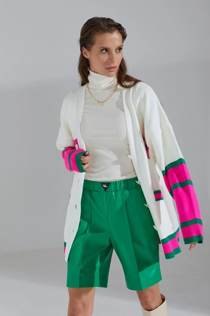 остюм трикотажный 3-х предметный, состоит из джемпера, боди и шорты. Джемпер трикотажный с застежкой на петли и пуговицы. Вырез горловины V-образный. Рукава длинные. На переде карманы. Длина ниже линии бедер. Модель представлена в размере “one size”.Боди прилегающего силуэта из мягкого трикотажного полотна, с длинным узким рукавом. Воротник - высокая стойка. Застежка снизу на бельевые кнопки Шорты из эластичной эко кожи, прямые, удлинённые. Верх собран на резинку. В боковых швах карманы. На поясе декоративный элемент с фирменным логотипом VL. Рукав джемпер: 50 см.