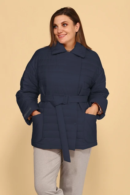 Куртка женская стеганная на утеплителе со смещенной застежкой на кнопки и съёмным поясом с пряжкой . Перед с накладными карманами , спинка с декоративной кокеткой цельнокроенной с верхней частью рукава , рукава рубашечного типа с верхним и нижним швом .подкладка с декоративным рисунком