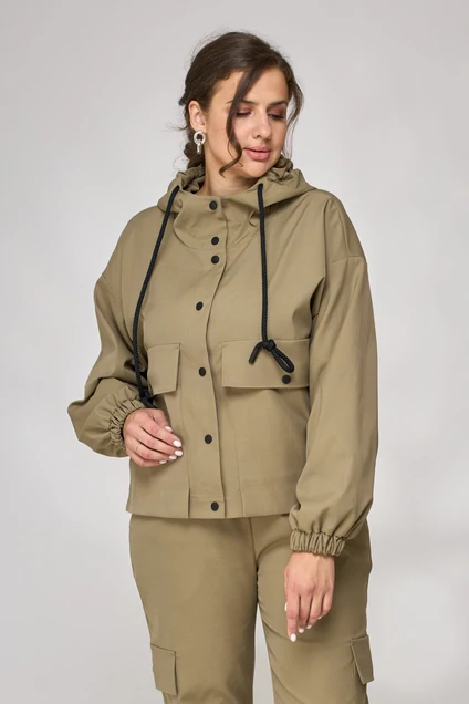 Жакет-ветровка женский прямого силуэта с капюшоном, с эластичной тесьмой по низу спинки, центральная застежка на кнопках, с накладными карманами, клапанами на кнопках. Рукава втачные с манжетом по низу на эластичной тесьме. Спинка с печатью по центру.