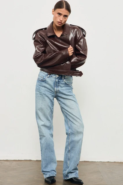 Куртка из экокожи, по переду застежка на кнопки. По низу функциональный пояс из основной ткани изделия. Спущенная линия плеча, по низу рукава манжета с патой.