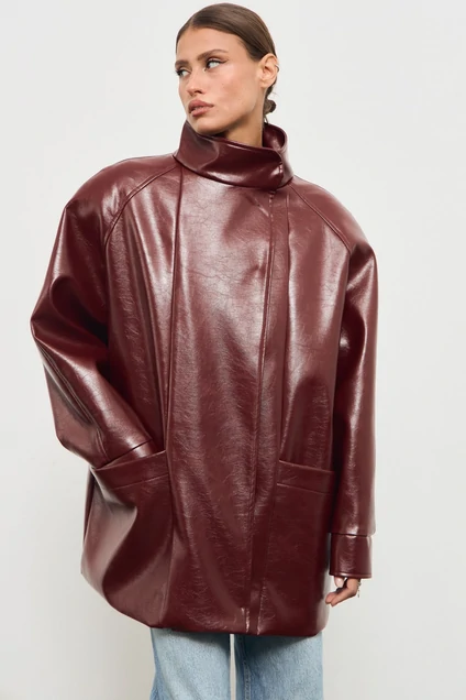 Куртка прямого силуэта, модель оверсайз из экокожи. По переду изделия два накладных кармана. Застежка-молния, закрывающаяся планкой. Планка застёгивается на металлические кнопки. Рукав-реглан с манжетой на кнопке.