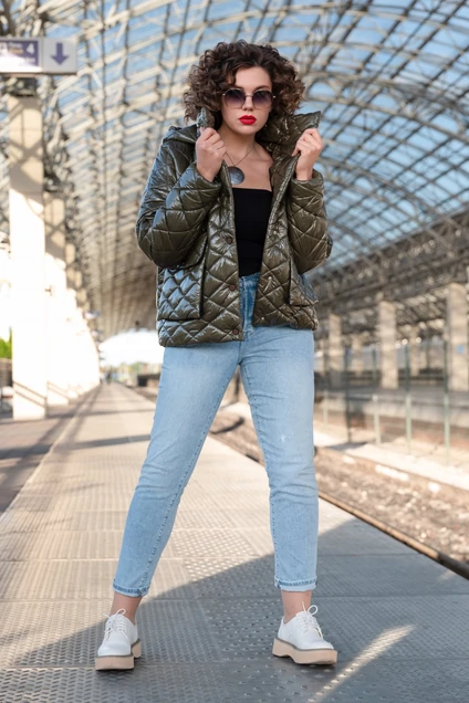 Стёганная куртка оверсайз, на утеплителе, сезонность - еврозима, покрытие материала верха "ЛАКЭ". Рукав втачной на спущенной пройме, длина рукава от горловины 74 см. Куртка с капюшоном, застежка на кнопки, на переде объемные накладные карманы. Низ рукава обработан со внутренней манжетой - "довяз". Изделие на подкладе.