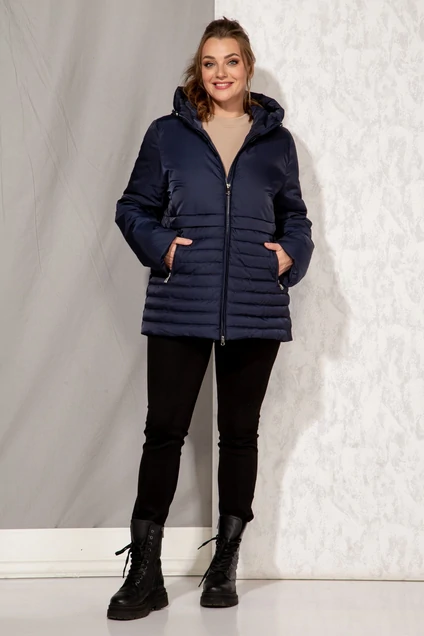 Куртка женская, демисезонная, из гладкокрашеной полиэфирной ткани, с наполнителем холлофайбер, рассчитана на температуру от 0 до -10 (холодная осень, весна, теплая зима). Изделия из данного материала способны прослужить своему владельцу достаточно длительное время. В особенно холодные месяцы такой наполнитель будет отлично удерживать тепло. Изделие имеет частично гладкую, частично стеганную основу. Куртка прямого, свободного силуэта, базового классического кроя, длиной чуть ниже подъягодичной складки (в зависимость от роста потребителя). Передняя часть куртки с двумя нагрудными выточками, горизонтальным порезом в виде складки на уровне чуть ниже линии груди и двумя вертикальными, функциональными карманами на молнии. Застежка встык на разъемную тесьму «молния» и притачной ветрозащитной планкой внутри. Застежка имеет длину от линии низа до верхнего края капюшона. Спинка цельнокроеная. Рукав двухшовный, втачной, длинный. По низу изделия, во внутренней стороне, предусмотрена дополнительная стяжка на шнур, концы которого выведены через люверсы в боковых швах. Капюшон с отрезной центральной частью, притачной по линии горловины, со шнуром по переднему краю, концы которого выведены через люверсы, которые фиксируют степень прилегания к голове. Подкладка гладкая, однотонная, имеет дополнительный внутренний карман.