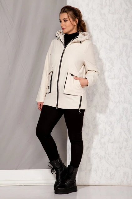 Спинка с двумя вертикальными рельефами. Боковой шов изделия слегка переходит на переднюю часть. В нижней части бокового шва расположен декоративный элемент в виде молнии контрастного черного цвета. Рукав двухшовный, втачной, длинный. Капюшон с отрезной центральной частью, притачной по линии горловины, со шнуром по краю, концы которого выведены через люверсы, которые фиксируют степень прилегания к голове. Подкладка стеганая, однотонная.