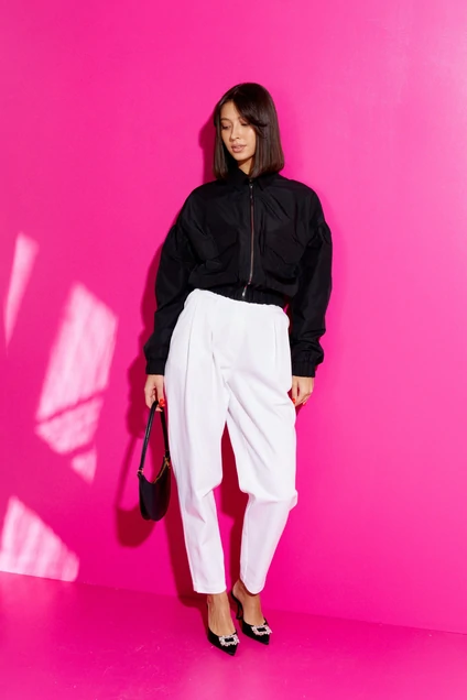 Характеристики: укороченная, прямой свободный крой, воротник остроугольный, застежка центральная на металлическую молнию, рукав объёмный спущен, по низу рукава широкая резинка, по переду крупные функциональный карманы, спинка цельнокроеная, по низу резинка.