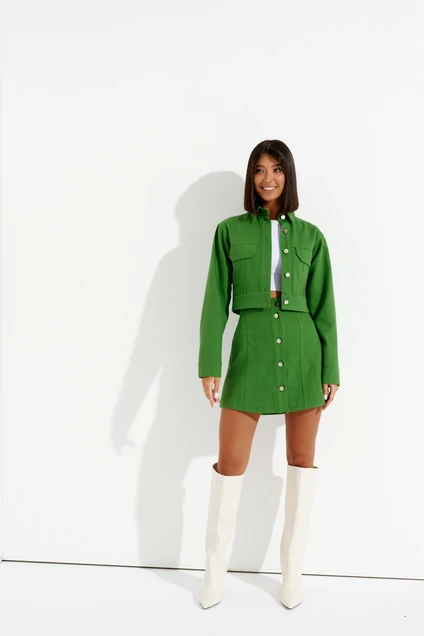 Укороченная куртка выполнена из хлопковой джинсовой ткани насыщенного зеленого цвета. Стильная вещь в Вашем гардеробе, прекрасно дополнит любой образ, насыщенный цвет сделает образ ярким.