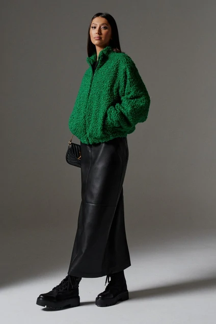 Куртка свободного кроя с эластичным низом выполнена из искусственного меха кудрявой текстуры насыщенного зелёного цвета. Практичная, стильная, удобная куртка в Вашем образе идеально дополнит роскошные природные краски осени. Характеристик: свободный крой, подкладка, горловина стойка, застежка центральная - молния, рукав спущен, низ рукава и низ изделия эластичный. Длина изделия 57, длина рукава от края горловины 58 см.