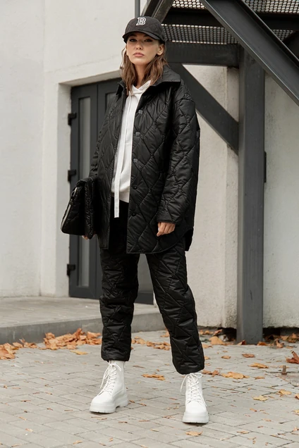 Куртка прямого силуэта со спущенным плечом , застёжка центральная на кнопки. Карманы- листочки с втачными концами, воротник-стоячеотложной на отрезной стойке. Низ куртки фигурный. На правой части переда выполнена вышивка. Куртка из плащевой ткани на синтепоне и подкладке с фигурной стёжкой.