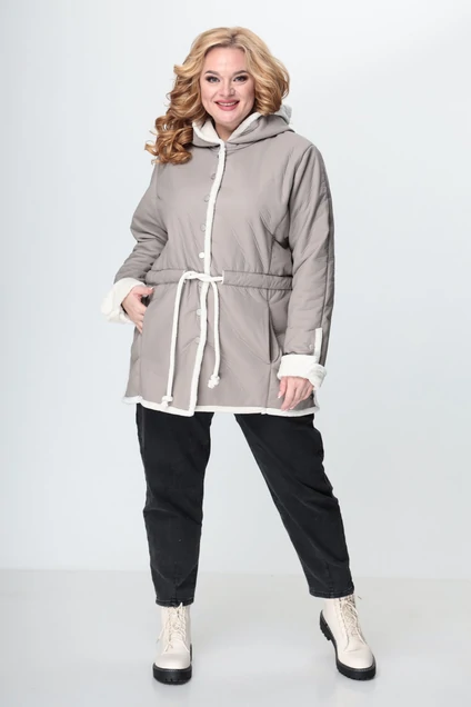 Полочка с рельефами, в которых расположены внутренние функциональные карманы. По полочке и спинке чуть ниже талии обработана кулиса, в которую втянут декоративный шнур. Застежка центральная на кнопки, капюшон втачной. . Спинка с центральным швом. Рукав втачной одношовный. В боковых швах куртки и на рукавах функциональные шлицы.