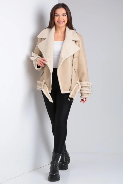 В полочку вставлены прорезные функциональные карманы на молнии, застежка дубленки на косую металлическую молнию. Воротник отложной двухсторонний. Спинка со средним швом. Рукав втачной одношовный, низ рукава на пряжках с металлическими полукольцами. Низ изделия с поясом с металлическими полукольцами. В модели есть прибавка на верхнюю одежду.