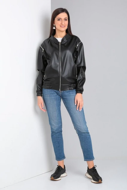 Оригинальная куртка из экокожи от Celentano. Застежка центральная на молнию, горловина обработана фигурным втачным воротником. На полочке расположены внутренние карманы на молнии. Спинка с центральным швом. Рукав втачной одношовный, в месте втачивания рукава в плечо обработаны функциональные молнии. Снизу рукавов и куртки широкая манжета на резинке.