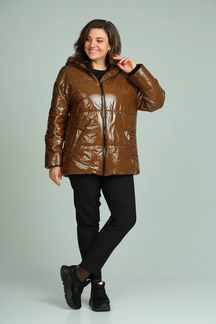 Куртка женская с центральной застёжкой на тесьму-молнию.Линия плеча спущенная,рукав втачной одношовный с притачным манжетом(довяз). По переду карманы с листочкой. Капюшон с центральной частью. По низу издлелия потайная кулиса на резинку с фиксатороми; по отлёту капюшона кулиса с резинкой с фиксаторами. В качестве отделки используется фурнитура и отделочная строчка, отделочные детали. Длина по спинке 77-80 см. , длина рукава 56-57 см.