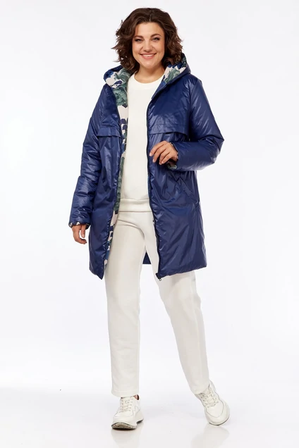 Куртка женская, прямого силуэта с центральной застёжкой на тесьму-молнию, двусторонняя используется две ткани. Лицевая сторона: по переду обработаны карманы с листочкой, отлетные кокетки, по спинке отлетная кокетка. Вторая сторона: по переду нагрудные вытачки, карманы накладные. Рукав втачной одношовный. Капюшон с центральной частью. Длина по спинке 85 см. , длина рукава 66 см.