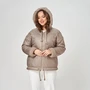 Куртка женская с центральной застёжкой на тесьму-молнию. Двусторонняя. Линия плеча спущена. Рукав втачной одношовный. По переду прорезные карманы с листочкой. Капюшон с центральной частью , по отлету-кулиса. По низу изделия - кулиса. Используется две ткани. Одна сторона простёганная плащёвка, вторая сторона искусственный мех. Длина по спинке 70 см, длина рукава 56 см.