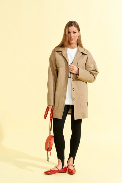 Парка женская из хлопковой костюмной ткани прямого силуэта, со спущенным плечом, длиной ниже линии бедер, с центральной бортовой застежкой на петли и пуговицы, на подкладке. Полочки с 2мя совмещенными накладными верхним с клапаном и нижним карманами. Спинка со средним швом. Рукав втачной двухшовный. Воротник отложной с отрезной стойкой.