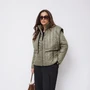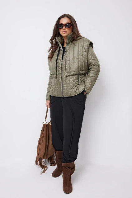 Комплект женский, состоящий из куртки, жилета и брюк. Куртка прямого силуэта, со спущенной линией плеча, рукава втачные длинные, воротник-стойка, застежка на тесьму молнию, на передней части расположены карманы с тесьмой молнией, куртка фигурными разрезами в боковых швах, край борта, низ куртки и низ рукавов окантованы. Жилет: свободной формы с круглой горловиной с застежкой молнией, низ жилета выполнен ввиде кулисы, край борта, горловины и проймы окантованы, на спинке жилета расположена настрачная декоративная нашивка. Брюки свободной формы (бананы) на притачном поясе с резинкой и декаротивным шнуром, брюки с заниженной линией сидения, в боковых швах карманы, на задней части брюк с левой стороны декоративный накладной карман, перед с фигурными авторскими рельефами, рельефы переда и боковые швы с открытым срезом.
