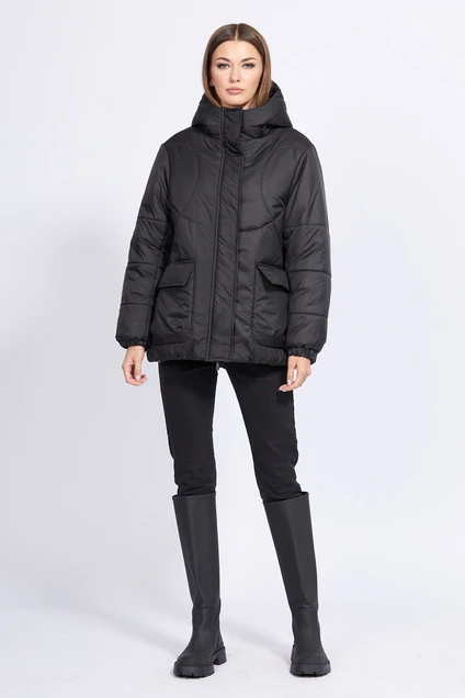 Куртка выполнена из плащевой ткани, простеганной с синтепоном. Куртка О-образного силуэта, длиной до линии бедер. Спереди застежка на молнию и планка-ветровик, застегивающаяся на пробивные кнопки. Карманы накладные с клапанами. Спинка цельная. Горловина округлой формы, обработана капюшоном. Рукав втачной, двухшовный. Низ рукава на манжете с эластичной тесьмой. По низу куртки с изнаночной стороны обработаны блочки и протянута шляпная резинка с фиксаторами. Куртка на притачной по низу подкладке.