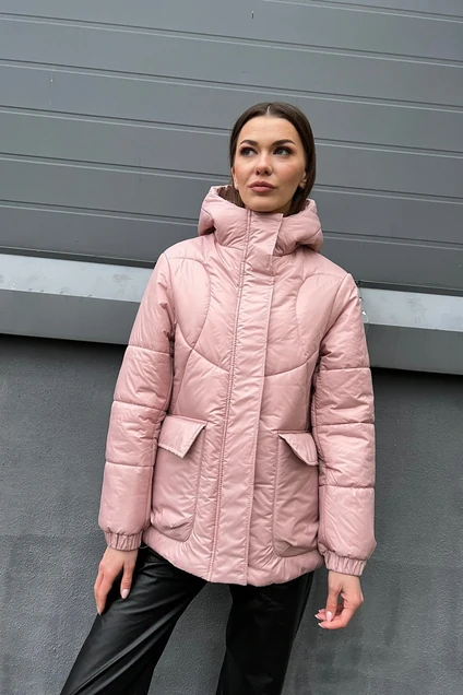 Куртка выполнена из плащевой ткани, простеганной с синтепоном. Куртка О-образного силуэта, длиной до линии бедер. Спереди застежка на молнию и планка-ветровик, застегивающаяся на пробивные кнопки. Карманы накладные с клапанами. Спинка цельная. Горловина округлой формы, обработана капюшоном. Рукав втачной, двухшовный. Низ рукава на манжете с эластичной тесьмой. По низу куртки с изнаночной стороны обработаны блочки и протянута шляпная резинка с фиксаторами. Куртка на притачной по низу подкладке.