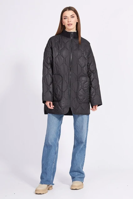 Куртка выполнена из плащевой ткани, простеганной с синтепоном. Куртка прямого силуэта, длиной ниже линии бедер. Спереди застежка на молнию. Карманы накладные. На спинке кокетка. Воротник-стойка из довяза. Плечевой шов спущен. Рукав одношовный. В боковых швах фигурные разрезы.