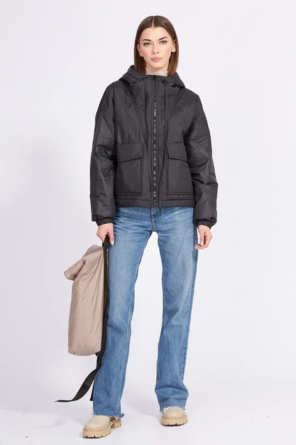 Куртка выполнена из плащевой ткани, простеганной с изософтом L60. Куртка прямого силуэта, длиной выше линии бедер. Спереди кокетка, переходящая в капюшон, накладные карманы с клапанами, застежка на молнию. На спинке кокетка и средний шов. Плечевой шов спущен. Рукав одношовный. Низ рукава на манжете с эластичной тесьмой. По низу куртки эластичная тесьма с фиксаторами. По спинке куртка декорирована нашивкой.