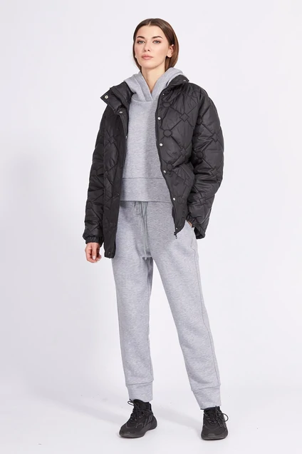 Куртка выполнена из плащевой ткани, простеганной с синтепоном. Куртка прямого силуэта, длиной до линии бедер. Спереди застежка на молнию и планку с пробивными кнопками, и прорезные карманы с листочкой. На спинке кокетка с декоративной печатью "ANGEL". Плечевой шов спущен. Воротник-стойка. Рукав покроя "реглан", одношовный, с плечевой вытачкой. Низ рукава на манжете с эластичной тесьмой.