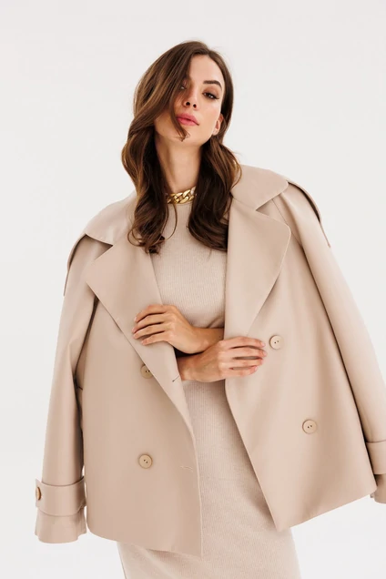 Куртка выполнена из экокожи. Куртка прямого силуэта, длиной до линии бедер. Спереди рельефы, карманы с листочкой, лацканы и центральная двухбортная застежка на пуговицы. На спинке средний шов. Воротник пиджачного типа. Рукав покроя полу-реглан, двухшовный. На уровне плеча погон, пристегивающийся на пуговицы. Куртка на притачной по низу подкладке.