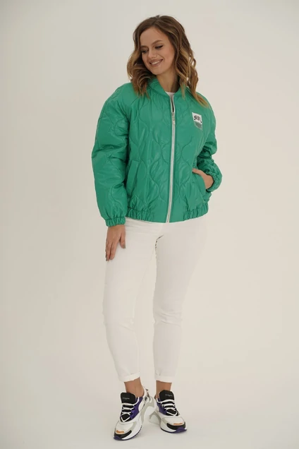 Универсальность - главный конёк бомберов, их можно носить практически круглый год. Летом - это гламурная штучка для создания креативного образа, а в межсезонье - надёжная защита от ветра и сырости. Свободный силуэт, покрой - реглан, застёжка центральная на тесьму - молнию, воротник стойка. Полочка с прорезными карманами с листочками. По низу изделия и рукавов - эластичная резинка. Длина изделия около 54 см. Длина рукава с плечом около 73 см.