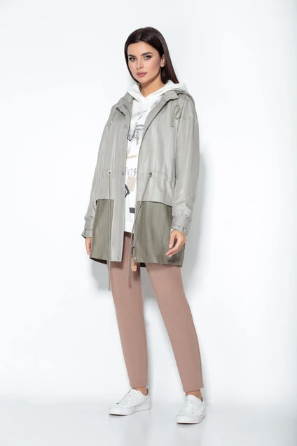 Куртка свободного силуэта двухцветная без подкладки. Перед с центральной застежкой на молнию и закрывающей ее планкой на кнопках. Верхняя часть отлетная соединяется с нижней кулисой со шнурком. В нижней боковой части наклонные карманы. Рукав со спущенным плечом с патой на "ленту-контакт" по низу. Воротник стойка с капюшоном. По краю капюшона кулиска со шнурком. Нижняя часть переда и спинки и внутренняя часть капюшона из ткани дополнительного цвета. Длина куртки - 80 см. Длина рукава - 53 см.