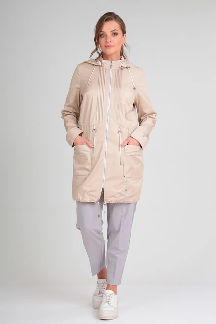 Куртка с центральной застежкой на молнию, воротником- стойкой, съемным капюшоном. Куртка отрезная по линии талии, шов присборен с помощью кулисы со шнуром. По верхней части переда односторонние складки, расположенные вдоль линии борта. По нижней части переда накладные карманы, входящие в боковой шов. Спинка с отрезной кокеткой. Низ куртки присборен с помощью кулисы со шнуром.