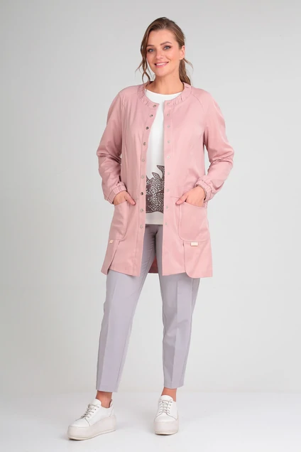 Куртка с центральной застежкой на кнопки, отрезной планкой горловины. Верхняя часть планки присборена. Куртка с втачным поясом по линии талии. Верхняя часть переда с рельефами, выходящими из проймы. Нижняя часть переда с накладными карманами фигурной формы. По низу переда две фигурные шлицы. Верхняя часть спинки с рельефами, выходящими из проймы. Нижняя часть спинки со шлицей, закрепленной кнопками.