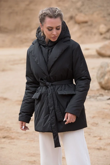 Куртка утепленная, с центральной застежкой на пришивные кнопки, отложным воротником и лацканами. Перед отрезной по линии талии, в шве расположены карманы. Спинка цельная. Куртка со съемным капюшоном с манишкой. Куртка со съемным поясом.