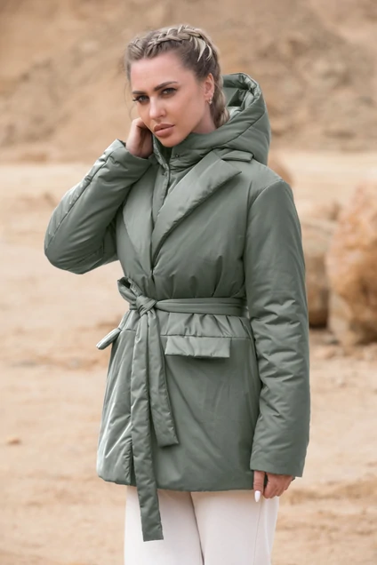 Куртка утепленная, с центральной застежкой на пришивные кнопки, отложным воротником и лацканами. Перед отрезной по линии талии, в шве расположены карманы. Спинка цельная. Куртка со съемным капюшоном с манишкой. Куртка со съемным поясом.