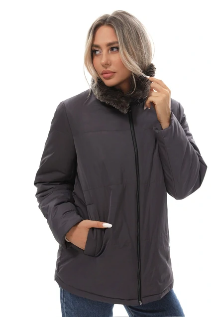 Куртка утепленная, с центральной застежкой на молнию, отложным воротником. Воротник с патой, застегивающейся на кнопки. На полочках расположены прорезные карманы с листочками.