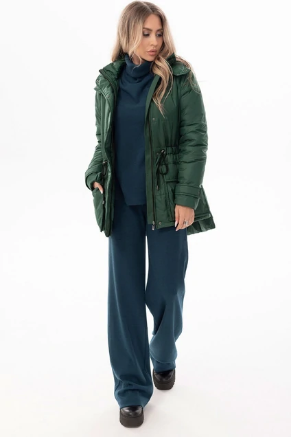 Куртка утепленная, с центральной застежкой на молнию, ветрозащитной планкой, застегивающейся на кнопки, втачным воротником- стойкой. На полочках расположены накладные карманы с клапанами. Куртка с капюшоном, пристегивающимся на молнию. Рукав с патой, закрепленной к рукаву кнопкой. На линии талии расположена кулиса со шнуром. Линия низа фигурная- имеется перепад длины спинки относительно переда. Подкладка утепленная.