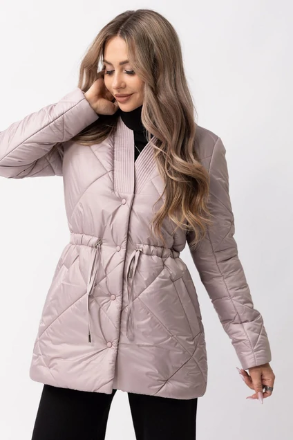 Куртка утепленная, с центральной застежкой на кнопки, втачным воротником, V-образным вырезом горловины. На полочках расположены прорезные карманы с листочками. На линии талии расположена кулиса со шнуром. Толщина синтепона 150г/м2, , изделие рекомендуется до -5 градусов.