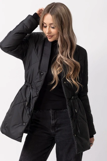 Куртка утепленная, с центральной застежкой на кнопки, втачным воротником, V-образным вырезом горловины. На полочках расположены прорезные карманы с листочками. На линии талии расположена кулиса со шнуром. Толщина синтепона 150г/м2, , изделие рекомендуется до -5 градусов.